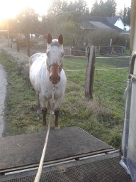 Suri schaut sich beide Seiten des Hängers genau an, schnaubt, geht zurück und kommt wieder auf die Rampe. Ich lobe jeden Vorstoß mit der Stimme, ab und zu mit Möhre. Sie traut sich immer mehr, und schon bald steht sie komplett auf dem Hänger. Zwar schaut ihr Hintern noch raus, aber ich bin zufrieden mit dem Tagesergebnis und entlasse sie in ihren verdienten Feierabend.