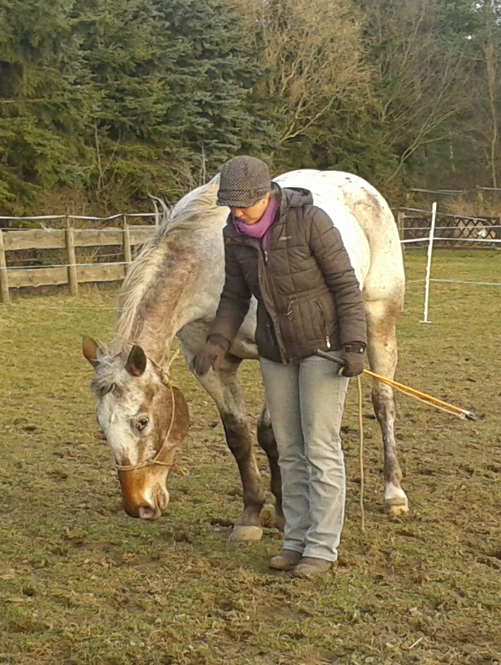 Wenn mein Pferd erfolgreich den Kopf senkt, lobe ich überschwänglich. Jetzt leckt und kaut es, ein Zeichen dass ihr Gehirn aktiv ist und die Informationen verarbeitet.