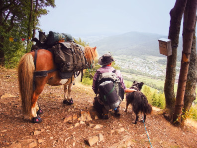 Egon gehörte einer Freundin von ihr und war schon als Packpony unterwegs. Da Sarahs Freundin nach Polen wandern wollte, sollte Egon eigentlich mit und das Gepäck tragen. Aber beim Probelauf wurde klar, dass Egon zu langsam für eine so große Tour ist. So zog er zu Sarah, ihrem Mann Timo und deren Mischlingshund Sturmi und bereichert seitdem die Wanderungen der drei.
